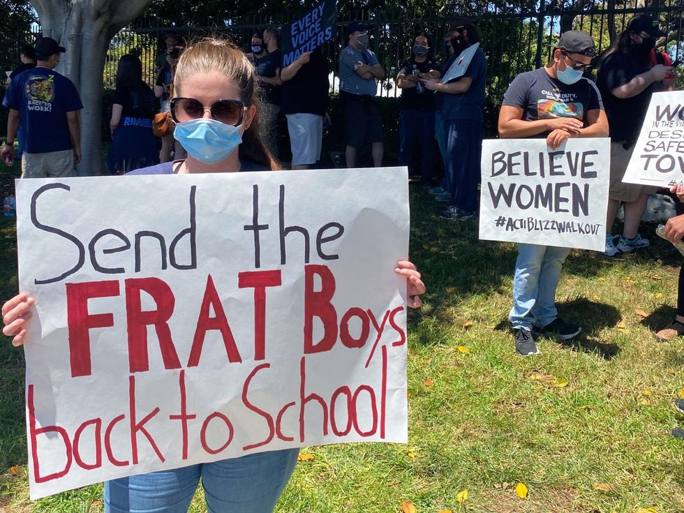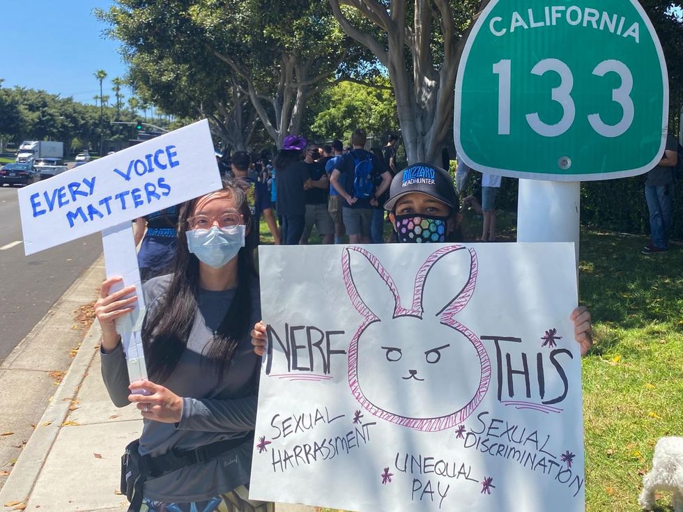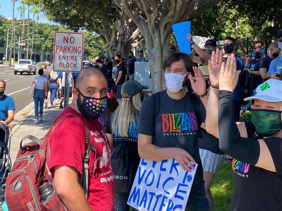 Hundreds of Activision Blizzard employees in Irvine and many more remotely walked off the job on Wednesday to protest a misogynistic workplace culture. They carried signs like "Send the Frat Boys Back to School" and "Every Voice Matters."