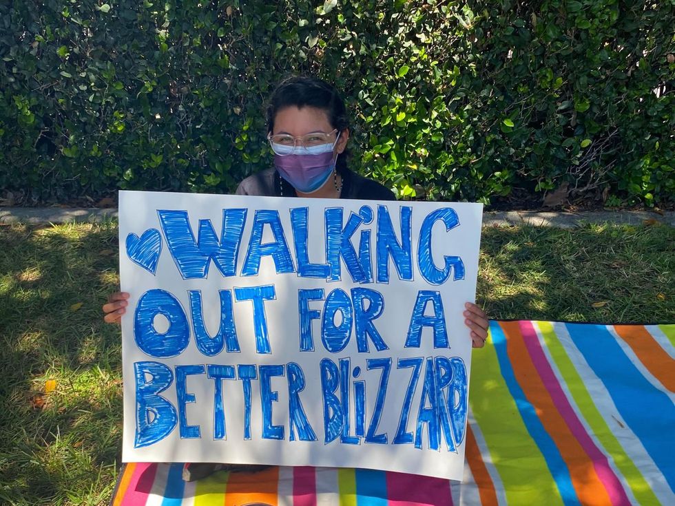 Protesters, many wearing Blizzard t-shirts, sat on picnic blankets and lawn chairs and held posters bearing slogans including "Walking Out For A Better Blizzard." There were even a few pet dogs.