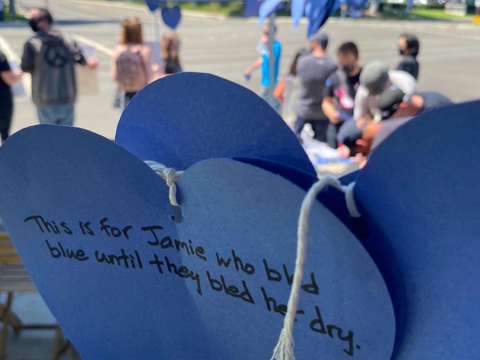 Outside the front gate of Blizzard employees hung blue hearts with notes expressing solidarity and sharing their own experiences.