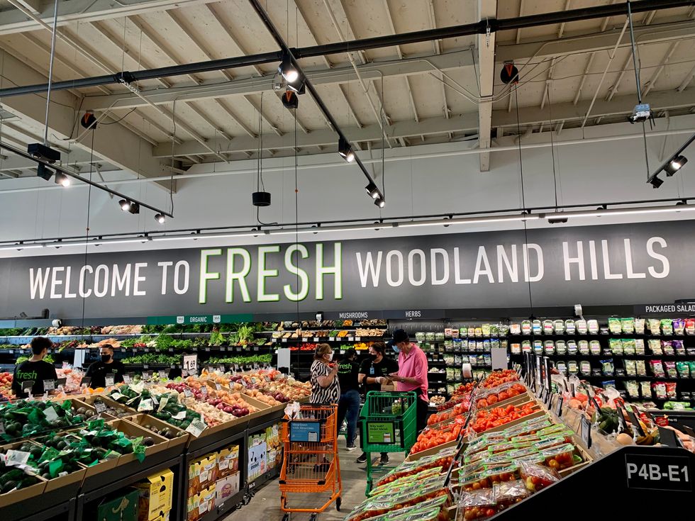 The Woodland Hills location at 6245 Topanga Canyon Blvd is likely a window into the future of Amazon grocery shopping. It allows customers to shop in-store, pick up Amazon Fresh online orders within the hour and even includes a return drop off center. It comes in the middle of a pandemic in which the online retailer has seen their grocery sales triple year-over-year.