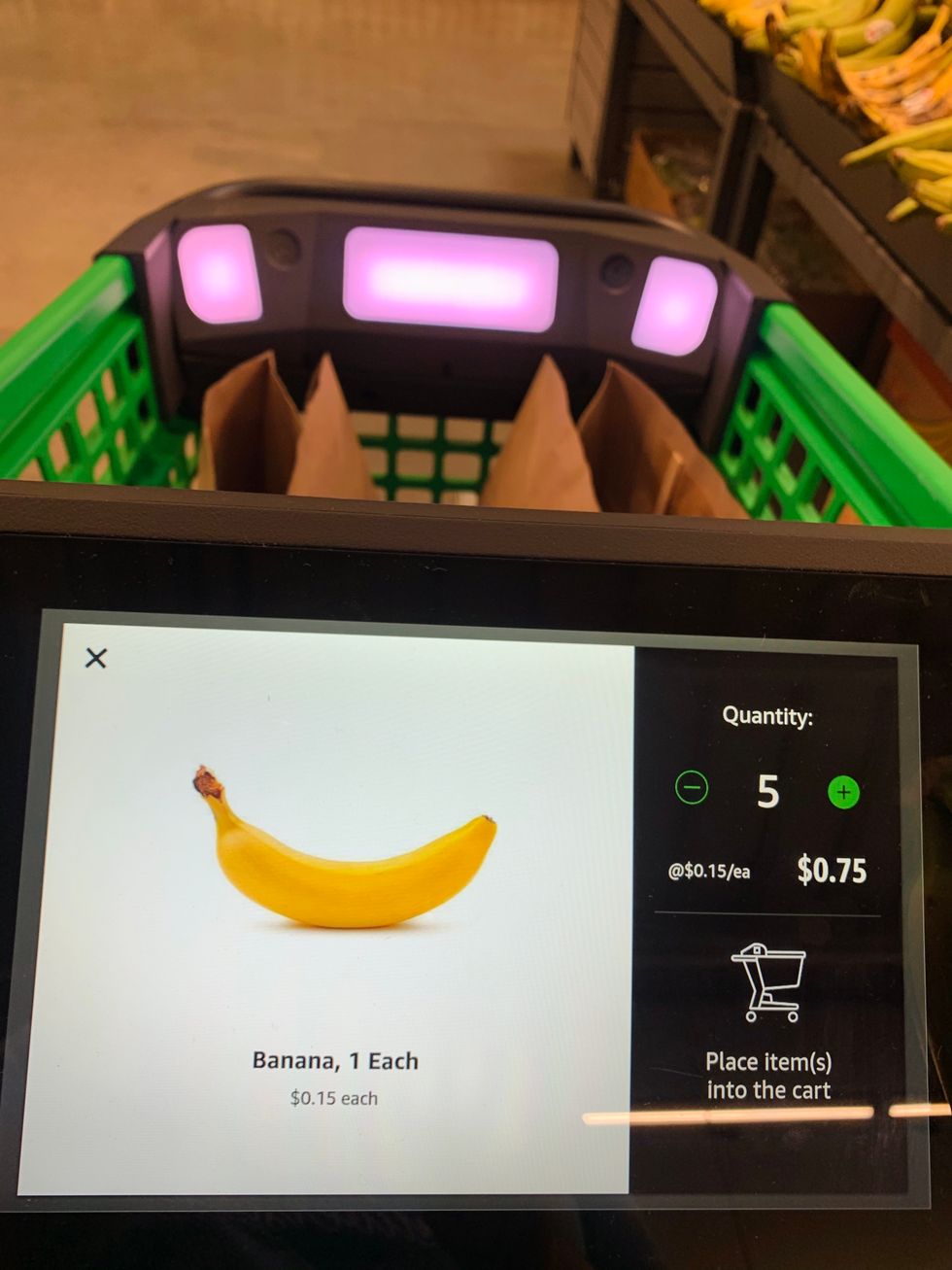 I held my account's QR code in front of a camera affixed to the cart and once scanned, the cart made a pinging sound and told me I could start shopping. Now everything I put in the cart would be charged to my account.