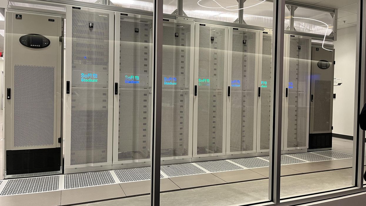 Originally, SoFi Stadium’s data center was designed to hold seven server racks and thousands of servers. But because the network is consolidated, the stadium only needs one-half of a rack that holds a few hundred servers to power the 300-acre property. (Implementing the technology required a lot of manpower: Over 17,000 people worked on the project, with 3,500 people on-site daily.)