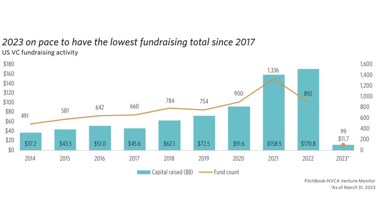 PitchBook estimates VCs in 2022 raised $170.8 billion, the highest in eight years. But 2023 appears so far to be on the downswing.