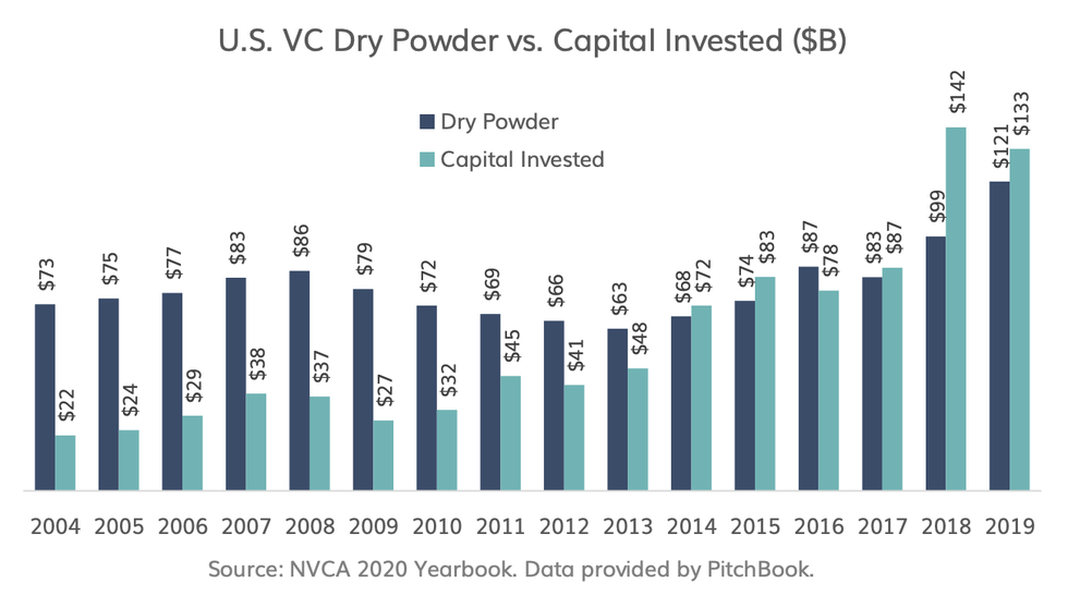 Funds looking to raise more capital will likely find it much harder as LPs face financial strain of their own and are less willing to commit to a riskier and less liquid asset class. During the global crisis, VC fundraising fell by nearly 60% from 2008 to 2009.